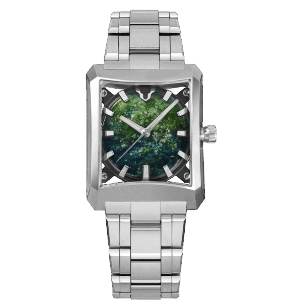5 Windows' dial is hand-crafted with delicate layers of blue-green pigments and was inspired by the harmony of Japanese gardens. Yellow and blue tones mix perfectly with the green and remind the gentle waves of a pond.