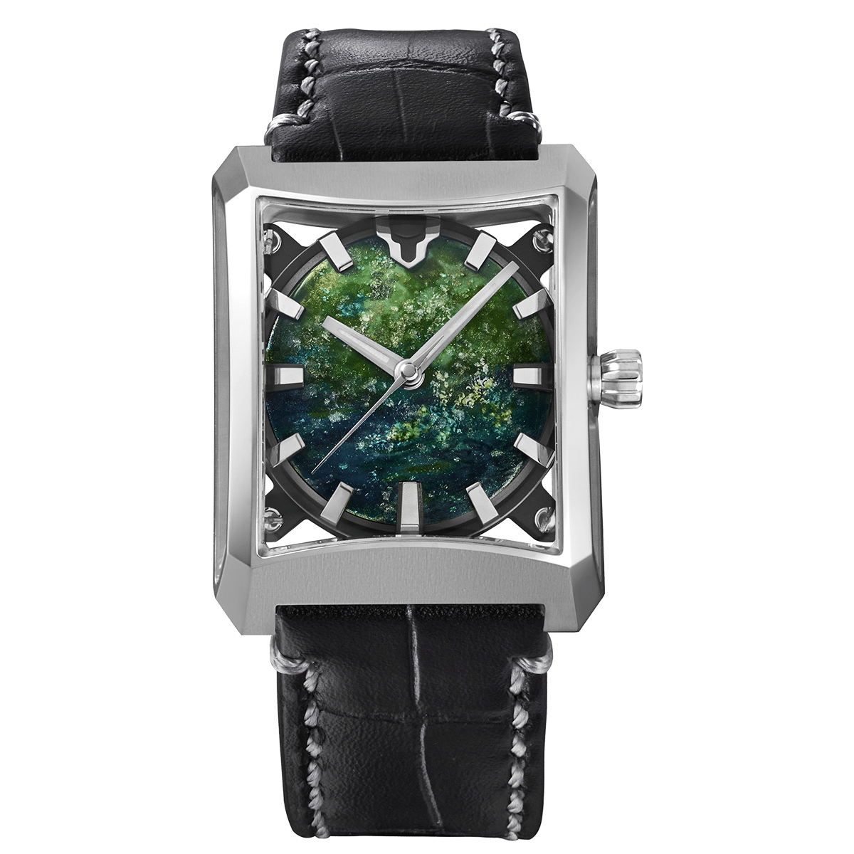 Divido Yusai's dial is crafted from mother-of-pearl, enhanced by an intricate layering of pigments. The surface thus shifts depending on the light, at times suggesting the soft radiance of a nebula, and at others, the serenity of a snowy landscape reflecting sunlight. Divido's unique design is inspired by the Japanese 3-dimentional puzzle. Through a revolutionary approach in watchmaking, the dial seems to be floating inside the case, suspended below the box-type sapphire window.