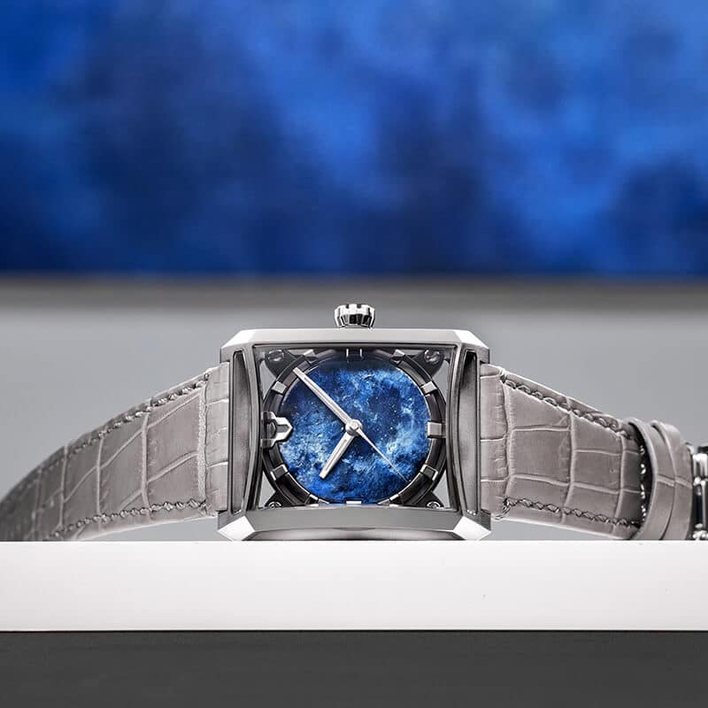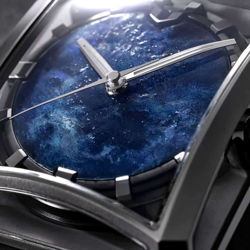 The dial is painted with multiple layers of blue pigments, creating a sense of depth. The artist’s variation of the blue color was designed to evoke a feeling of suspension and weightlessness.