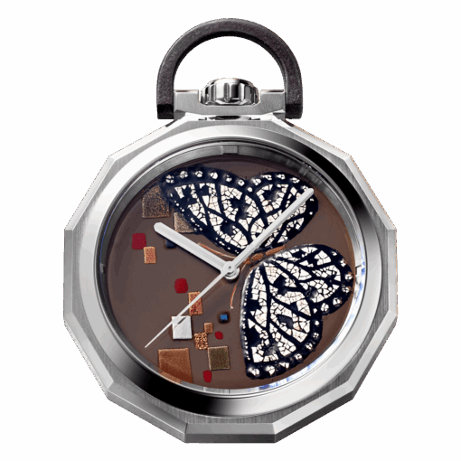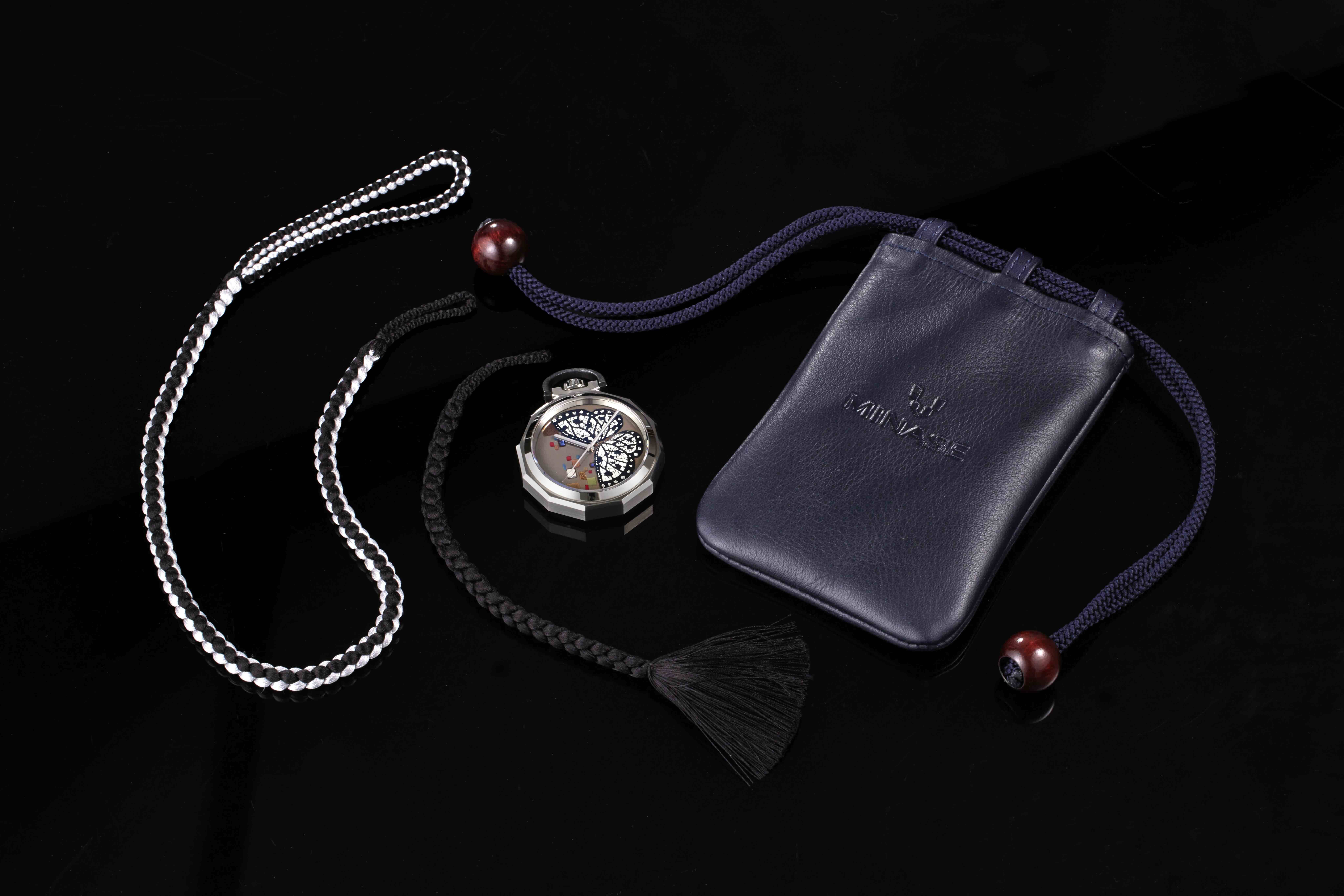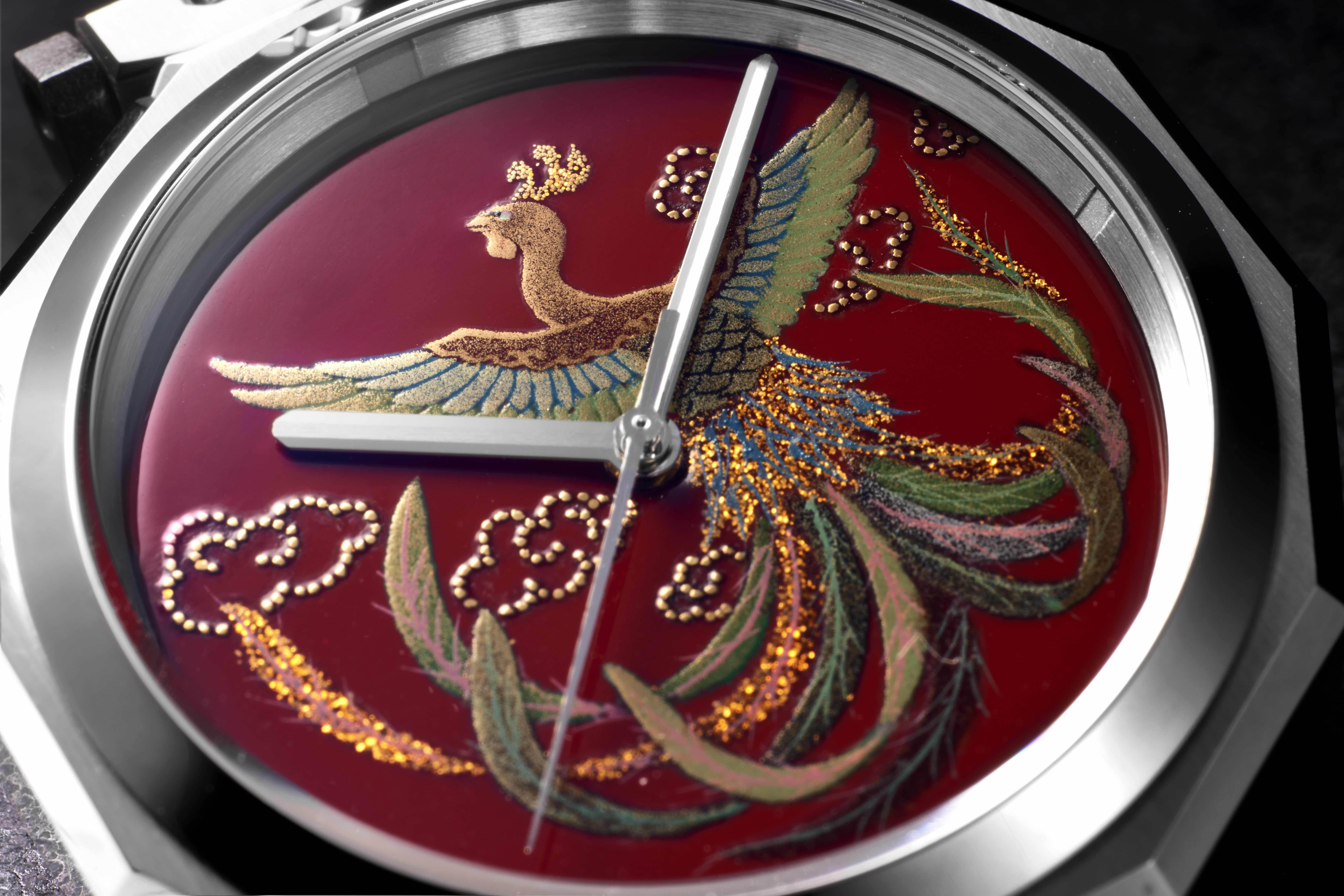 This exclusive and very high-end pocket watch celebrates Japanese craftsmanship. Two models (Asagimadara and Phoenix) are available either in stainless steel or 18k gold and produced strictly upon order. The dial showcases the traditional maki-e lacquer technique and both the bow and the caseback are made of Tamahagane steel. Tamahagane is a traditional Japanese steel, considered one of the finest materials in the world of metallurgy and used to forge katanas and other traditional swords.