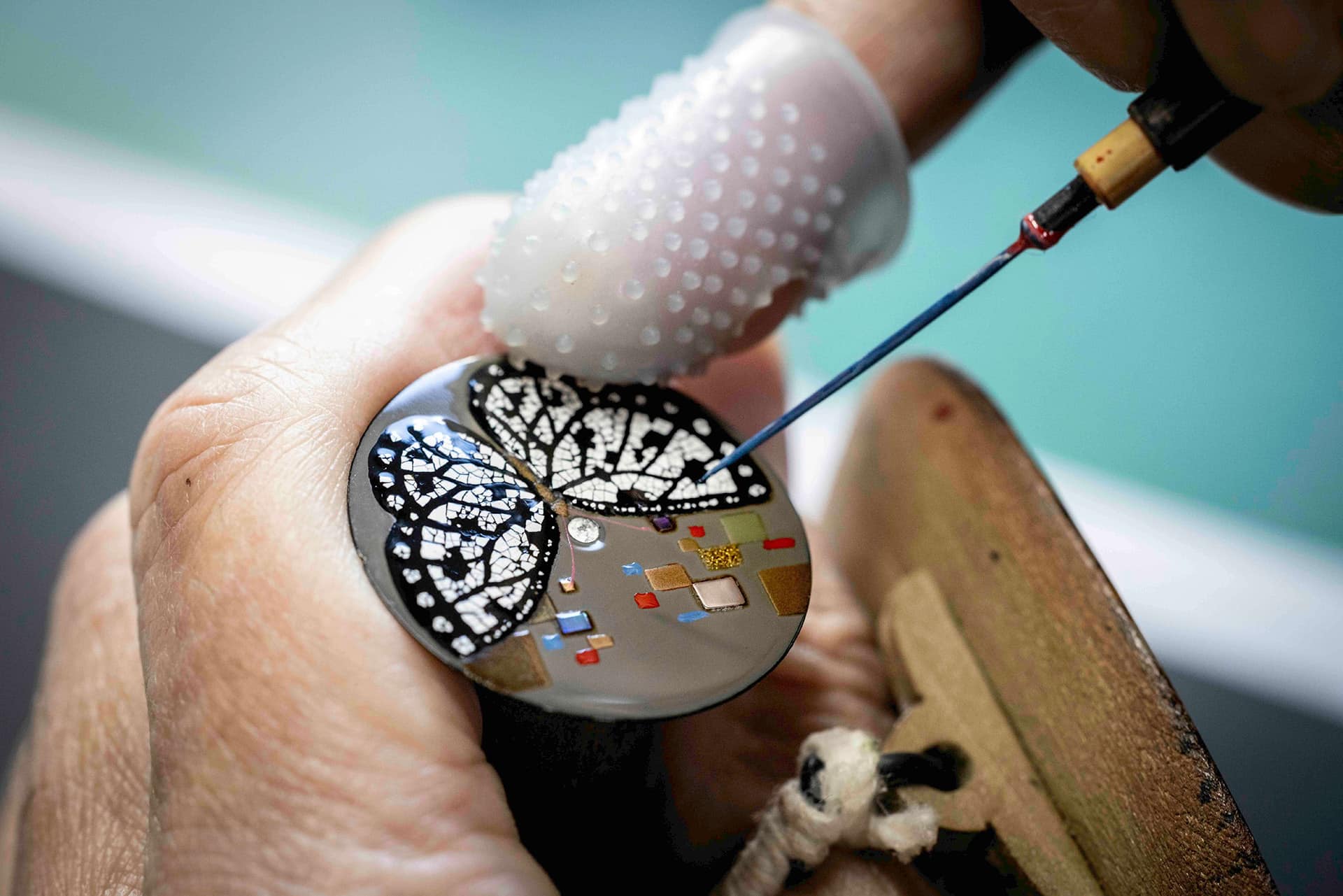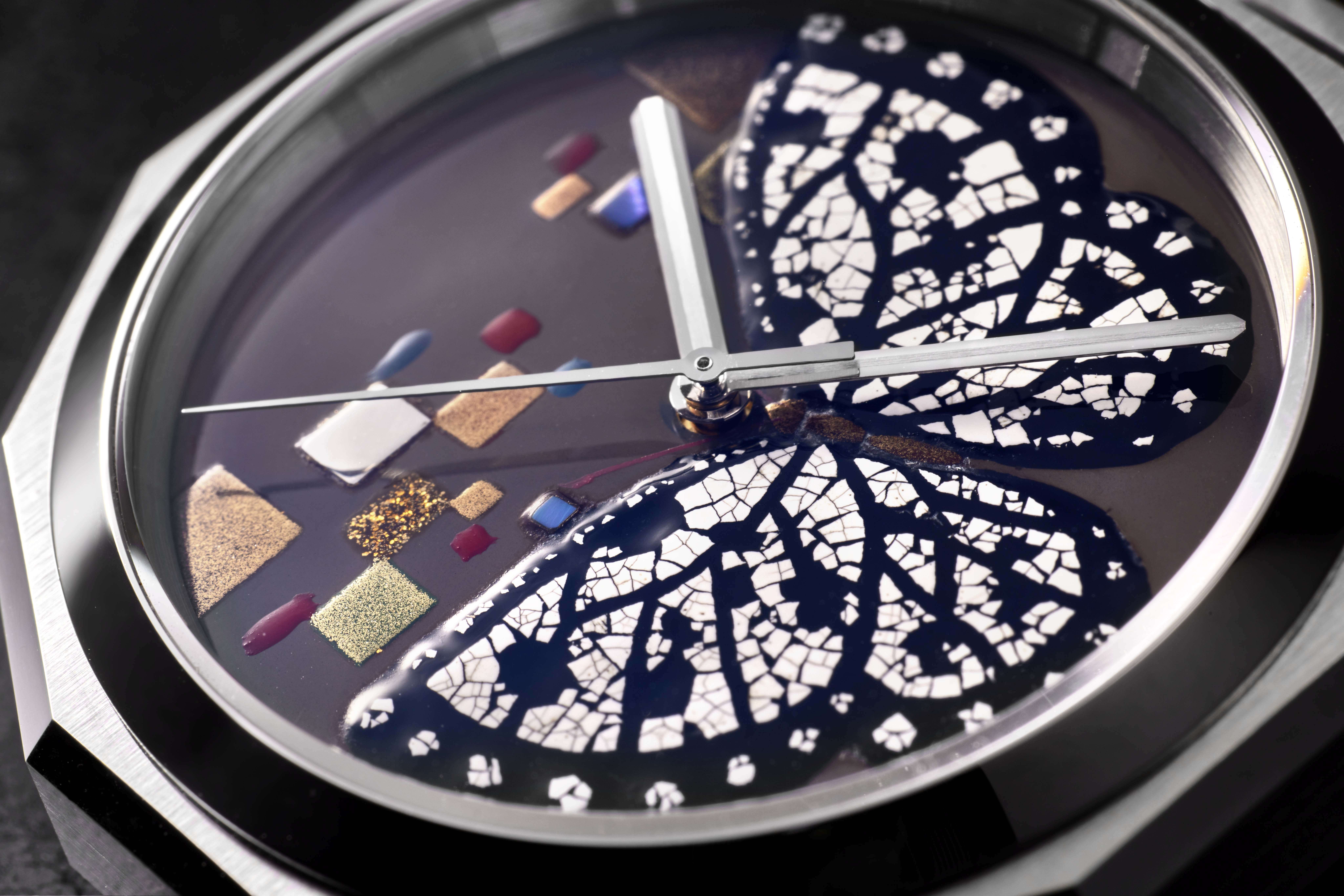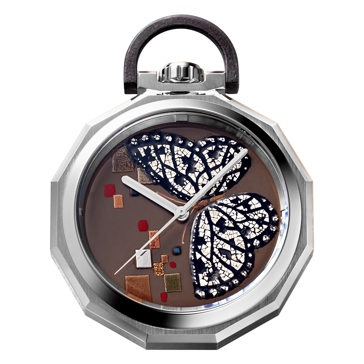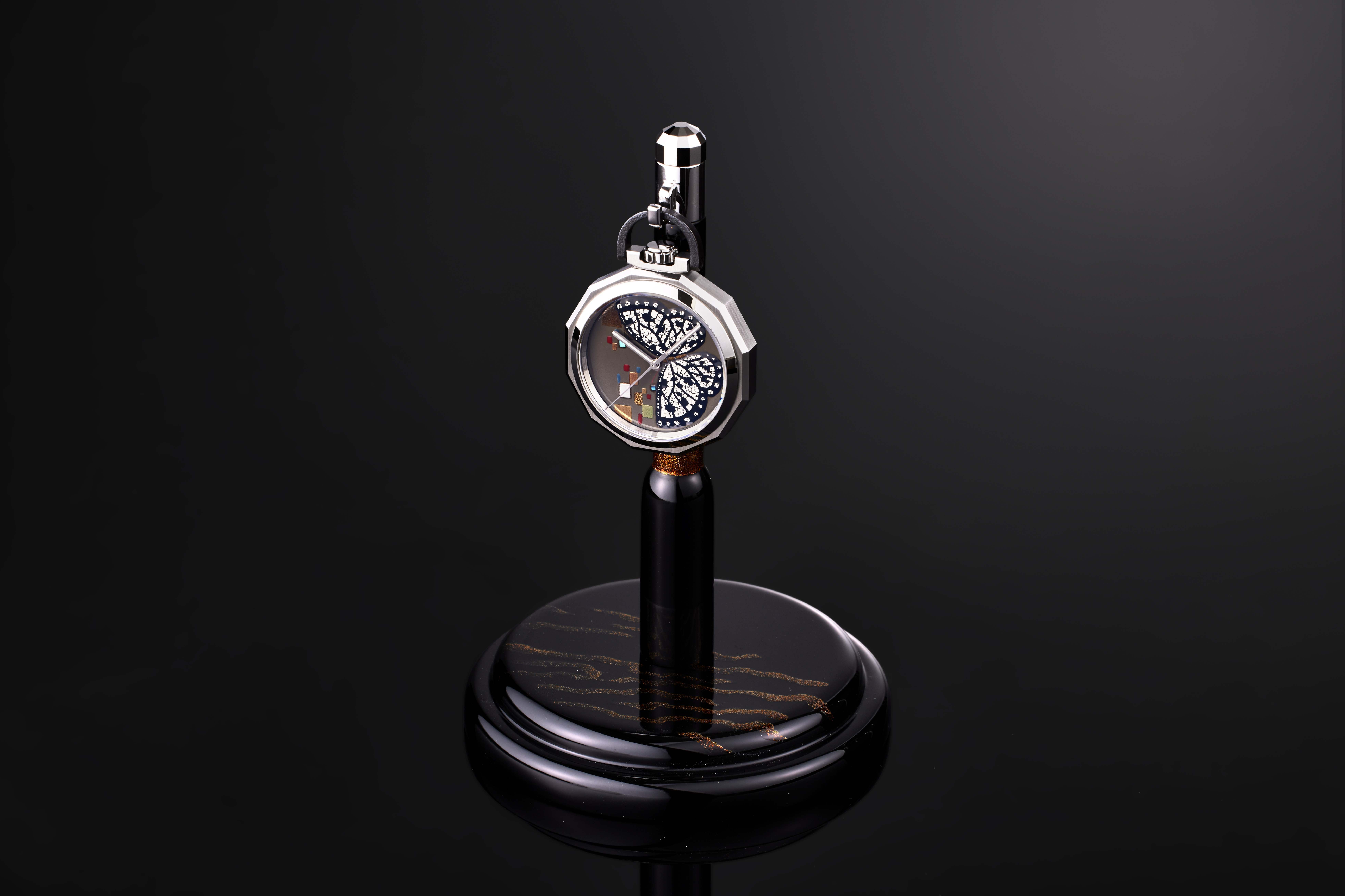 The Asagimadara is a migratory butterfly that can travel up to 2’000 kilometers, crossing seas and islands throughout Asia. In Japan, the Asagimadara symbolizes travel, seasonal change and connection across long distances. Lacquer artist Mr. Hakose envisioned the pocket watch as a bridge between Japan and the wider world—a vessel of cultural connection. The white areas of the butterfly’s wings are produced with shells of quail eggs crushed into fine fragments and placed onto the dial surface.