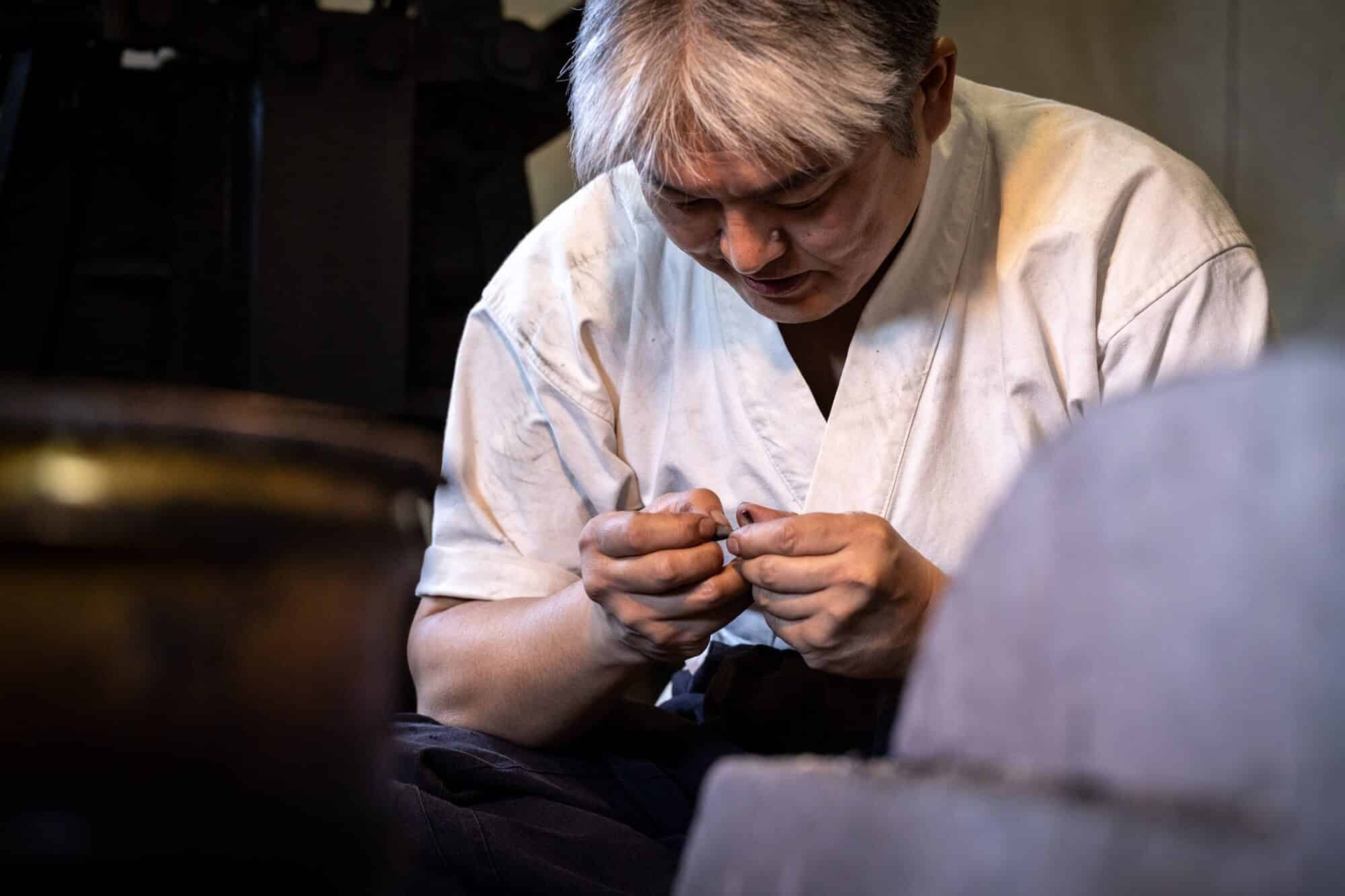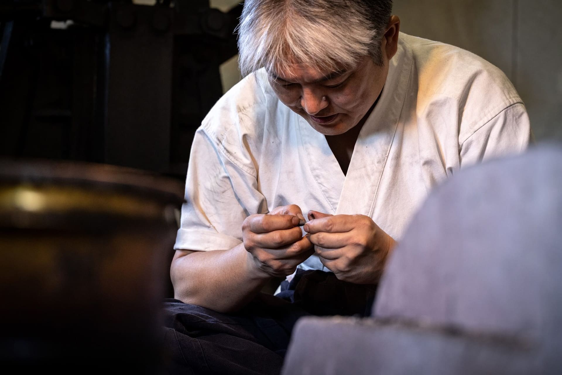 Tamahagane Steel is a low-carbon steel produced in a clay furnace. The caseback and bow of Minase's pocket watch are forged from this very same steel by Minase craftsmen before returning the components to the swordsmith to apply the patina.